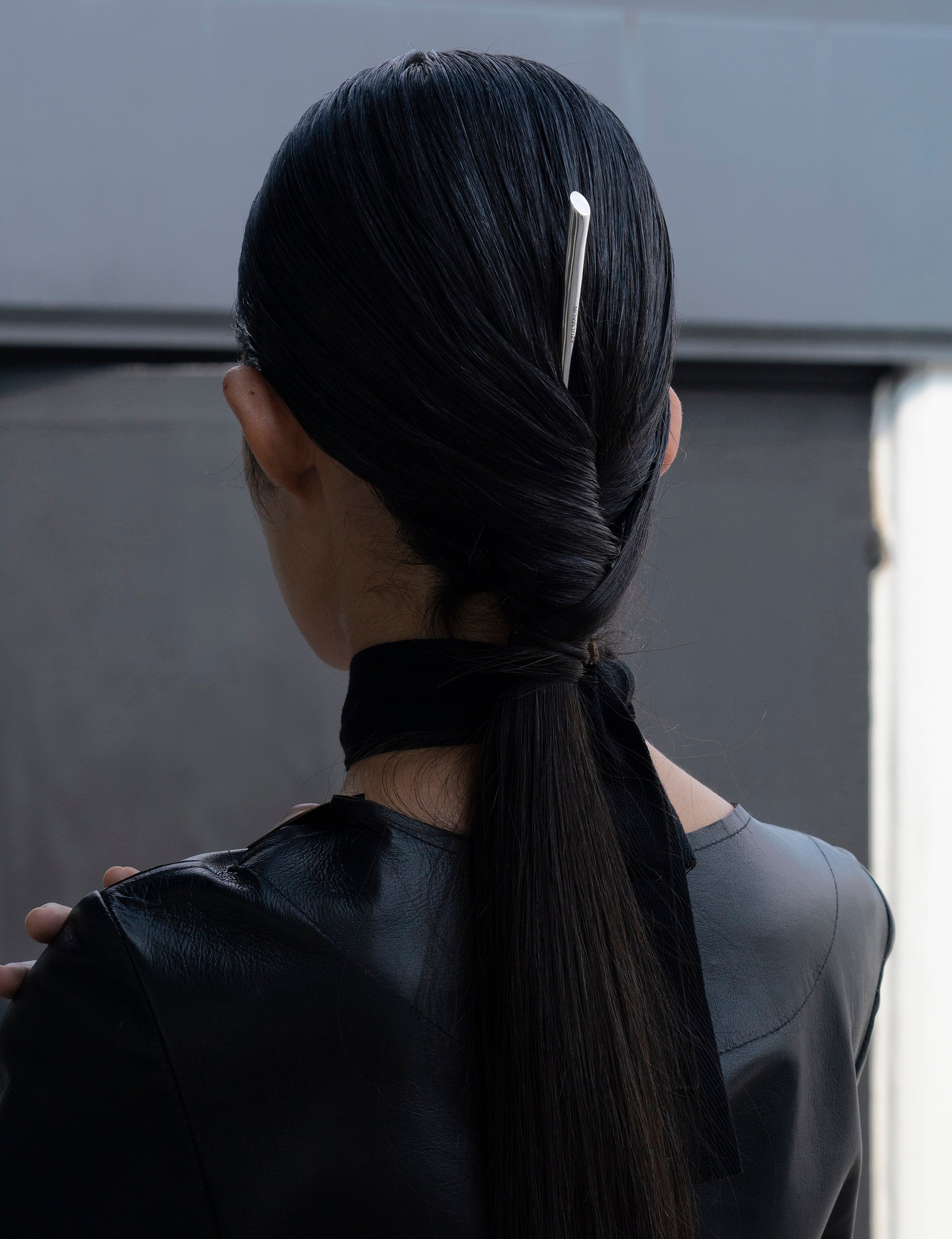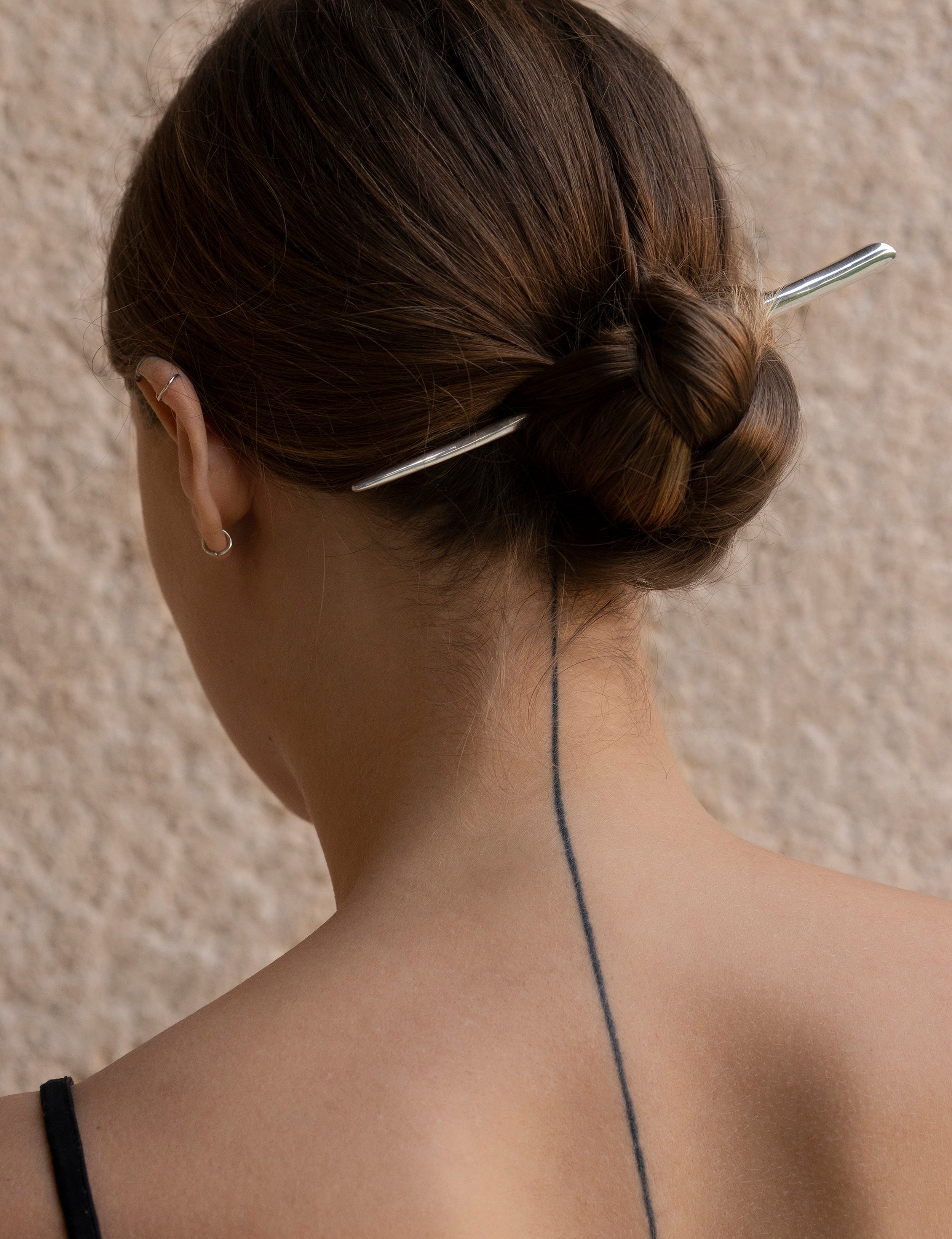 This piece is as simplistic as it is dramatic – a slim hairpin that can be worn in multiple ways to create a sophisticated knot. Graceful, yet with a touch of attitude to its tapered shape.
